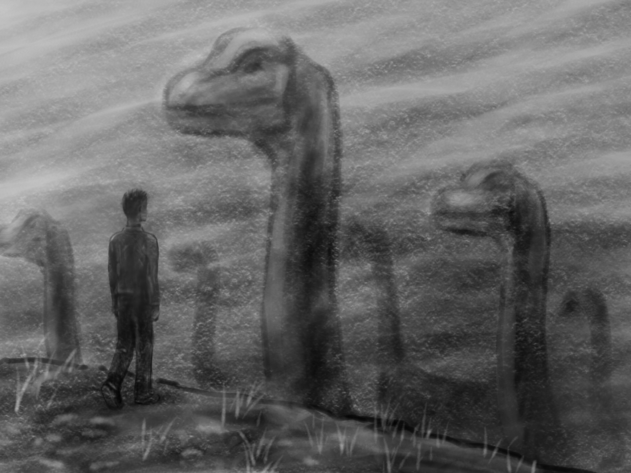 Разочаровавшийся парень отвернулся от них. Действительно, о чем он только думал. Просить о помощи таких существ? Они же ничего не понимают. Дилан уже хотел поднять свой байк, как услышал громкое для него, но не для этих созданий пение, подобное пению китов, блуждающих в глубинах океана. Повернувшись, человек увидел эдвара, стоявшего возле горы, на которой находился наш герой. Парень посмотрел на его полное благородства лицо, уходящее далеко ввысь, где птицы кружили, словно мухи. Голова эдвара медленно склонилась, позволив Дилану на нее взобраться. Чешуйчатое тело этого божества было схоже с кожей сигнепа. Эдвар развернулся и направился в противоположное направление своей стаи. Такие же бессмысленно-вопросительные глаза, как и в первый раз, окружали путников, но они молча шли против стада.
