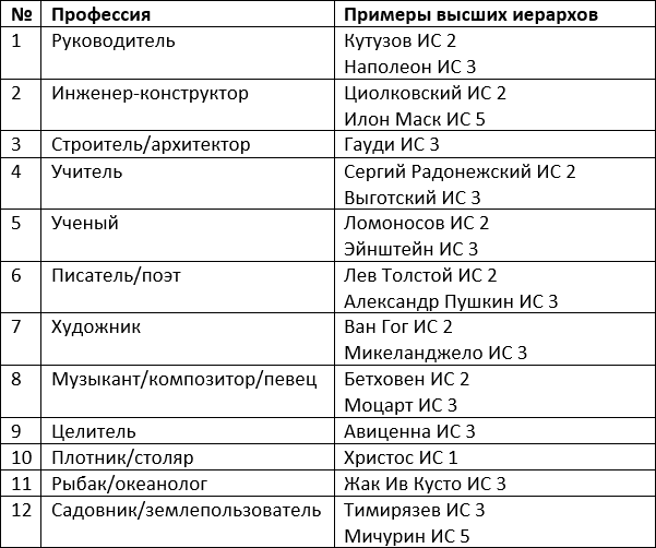 Вот перечень всех изначальных профессий (ИС = иерархия света, Х уровень):