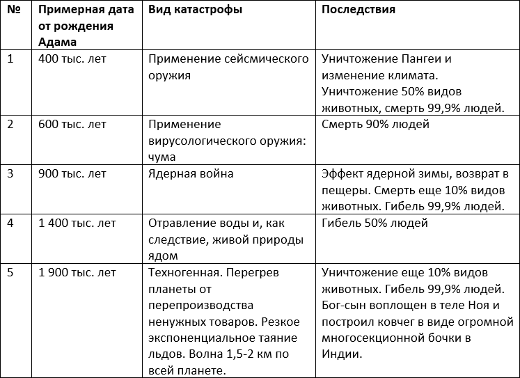 За два миллиона лет жизни человека на земле он организовал 5 глобальных катаклизмов, часть из которых привела к 99,9 % вымиранию населения людей, большому повреждению мира животных и ухудшению качества мира живой природы.