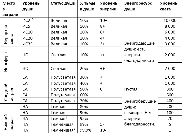 Когда душа человека покидает тело, на девятый день к ней приходит представитель иерархии света. Если душа светлая, общение теплое и путь души лежит в ноосферу. Если же душа темная, то общение отстранённое, как будто прочтение приговора в суде. Иерарх не испытывает жалости к темной душе, не стремится очистить её своим светом или поделиться энергией. Душа сама поставила себя в такое положение, ведь изначально все были в похожих стартовых условиях 2 млн лет назад. Фраза «Камнем лежать или гореть звездой» из песни Виктора Цоя (ИС3) «Кукушка» о том, что именно сама душа определяет исходя из своих поступков, где она окажется – внизу нижнего астрала или на вершине иерархии света.