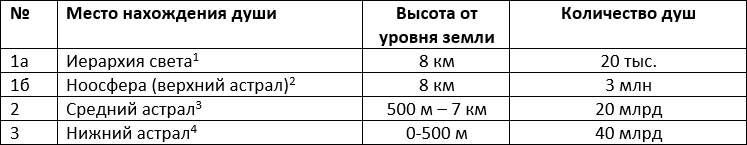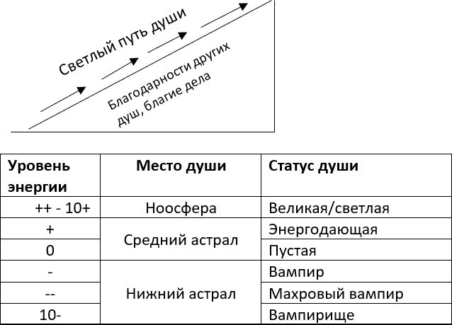 Великие души из иерархии света воплощались от 3500 до 7000 раз[10]. Души махровых вампиров в среднем 200 раз, выжидая длительную очередь на воплощение. Души кровавых вампиров «10-» смогли воплотиться за 2 млн лет от силы 5 раз. Такие черные души, покидая тело, не могут даже сдвинуться от места смерти. Они просто лежат на земле в том месте, где покинули тело, лежат там тысячелетиями, все видят и чувствуют, но не могут и пошевелиться. Поэтому реанимация в больнице и вообще пребывание в больнице противопоказано для светлой и великой души, которой не стоит касаться черной души, пока она не встала на пусть к свету и не очистилась достаточным образом, чтобы можно было это общение начать.