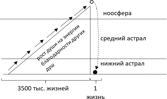 Души при воплощении обладают определенным запасом света и живой энергии. Эти параметры заданы исходя из прошлого опыта души. Если путь души устлан искренними благодарностями других душ, то душа увеличивает свою светлую сторону и получает больше энергии. И так из воплощения в воплощение двигаются чистые и трудолюбивые души вверх к ноосфере и иерархии света и наиболее способные, активные и трудолюбивые доходят до самого верха.