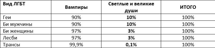 Поскольку вампиризм больше всего проявляется в семейных отношениях, душа вампира, стремящаяся к свету, решается на обет безбрачия. Она приходит в тело другого пола, чтобы не создавать отношений и прожить всю жизнь в одиночестве. Отсюда и феномен ЛГБТ в нашей жизни. Но не все ЛГБТ – это вампиры, которые устремились к свету.