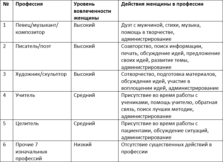 Светлая женщина при заключении небесного союза учитывает предпочитаемую профессию мужчины. Для кого-то из них профессия имеет мало значения, они ориентированы целиком на мужчину. А кому-то из них принципиально не только любить своего мужчину, но и заниматься своим любимым делом, которое она постигала в своих прежних воплощениях через помощь своим светлым мужчинам. Есть профессии, которые женские души любят больше других, в таблице ниже приведено отношение женских душ к профессиям своих мужчин.