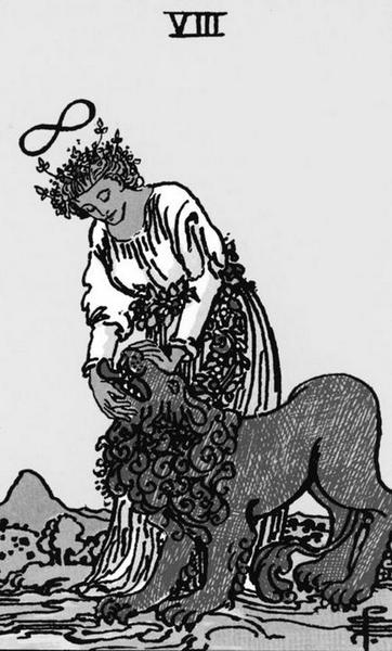 Барышня хочет усмирить Льва – это карта Силы. Сюжет карты перекликается с Самсоном, который порвал пасть льву[1]. Разум и дух (девушка) побеждают страсти и эмоциональные выплески (лев). Женское начало, которое направляет энергетику духа, и очищает его.