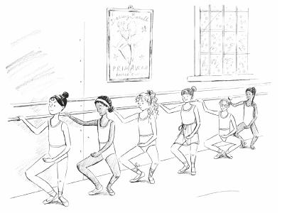 The class had already begun. Fourteen girls, wearing identical leotards, stood holding a wooden rail that ran around the walls of the room.
