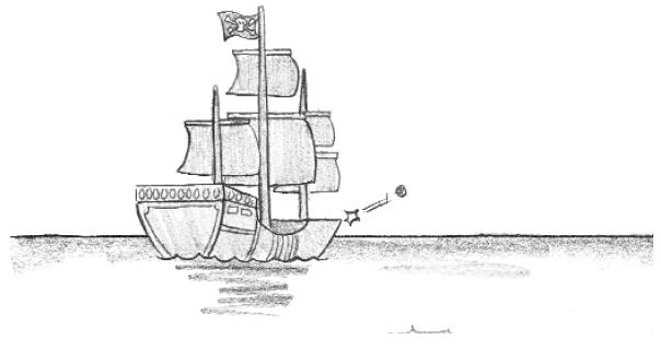 Rosa saw that the ship was just a little way off. Luckily the pirates seemed so busy partying, they hadn’t noticed Nutmeg and Rosa landing in the sea nearby. Another cannon boomed into the air and there was a great cheer from the deck. Rosa glanced behind them. The beach looked very far away. “What are we going to do?” she said in alarm.