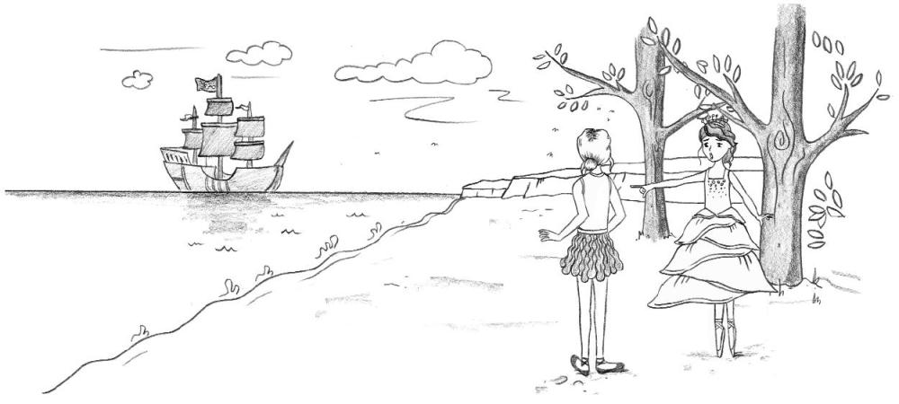 Nutmeg smiled in relief. “Thank you! But before we go I think we should disguise ourselves. If we arrive on the ship looking like this,” and she waved at her tutu and Rosa’s green and blue ballet dress, “we’ll be captured straight away! I’ll make us look like cabin boys. It’s a really big ship with lots of pirates, so hopefully no one will notice a few extra crew members.” The fairy thought for a moment. “Now what dance should I do to change our clothes?”