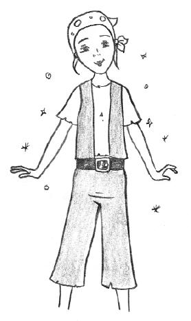 She had on a ragged white shirt, a brown waistcoat and dark cropped trousers with a leather belt. Her pale blonde hair was tied up in a bun and hidden by a red scarf.