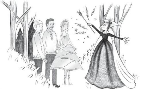 Rosa’s heart leaped at the sight of her friend. She began to run but as she got closer, she saw that the group were arguing with a large fairy wearing a black dress and a long cloak. Her grey hair was in a bun and she had a hooked nose and warts. She looked very scary. Rosa stopped at the edge of the clearing.
