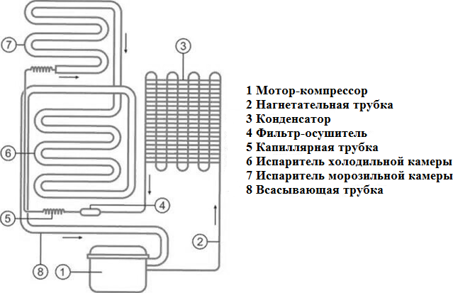 Рассмотрим устройство парокомпрессионной холодильной машины, состоящей из компрессора, конденсатора, испарителя и капиллярной трубки, в которых циркулирует рабочее вещество – хладагент (рис. 1).
