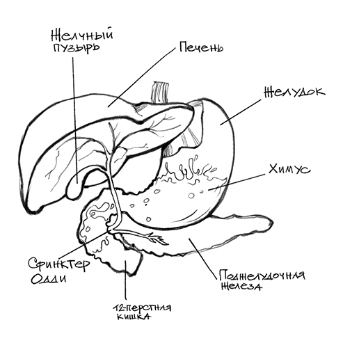 По обе стороны от двенадцатиперстной кишки располагаются желчный пузырь и поджелудочная железа, которые имеют протоки, соединяющиеся в ампулу и открывающиеся в дуоденальный сосочек с целью забросить в кишку ферменты, бикарбонаты и желчь для продолжения (или начала истинного) пищеварения.