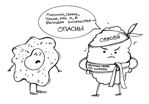 Поэтому, когда в следующий раз тебе снова захочется сказать, что грубая растительная пища – это не твое, то не спеши с выводами. Скорее всего, у тебя просто нарушен микробиом кишечника. Ведь если ты пойдешь по пути исключения источников клетчатки из своего рациона, то произойти могут крайне неприятные вещи. Да, на некоторое время симптоматика сойдет на нет, так как просветочным бактериям просто нечего будет есть, но свято место пусто не бывает – это наиболее актуальная фраза в отношении микроорганизмов нашего тела. Ты же помнишь про неизменные 2,5 кг. Это еще одно из проявлений гомеостаза, то есть постоянства внутренней среды. В сущности, микробиом – тот же орган, наряду с кровью и лимфой. И при любых обстоятельствах крови в человеке должно быть не менее 3,5 литра, лимфы – не менее 2 литров, а бактерий – не менее 2 кг. Так что умрут хорошие, кто придет на их место? Правильно. Обедняя свое питание, переходя на булки с макаронами, ты создаешь условия для жизни и развития патогенных микроорганизмов, которые будут выделять не безобидные газы, а токсичный сероводород (фу, кажется, это слово уже само по себе попахивает тухлыми яйцами), аммиак и смесь остаточных количеств ароматических углеводородов.