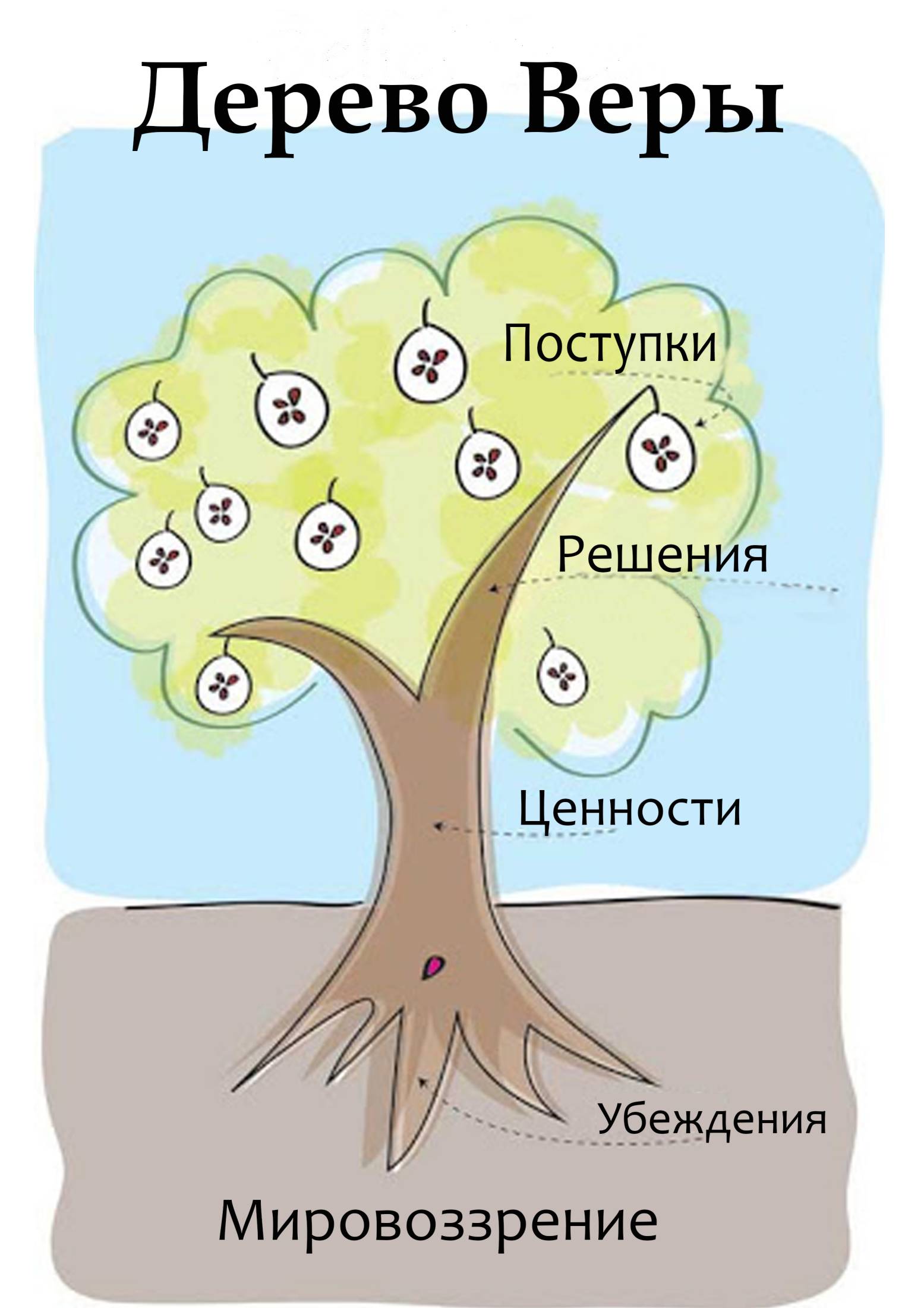 Начинаем мы с «почвы», которая представляет собой мировоззрение окружения, формирующего человека. Оно может быть буддистским, индуистским, анимистическим, светским гуманизмом и пр. Корни – это базисные убеждения. Мы, как МсМ, укоренены в библейском христианском мировоззрении. Ствол дерева – это наши ценности, «выросшие» из наших убеждений. Ветви – это решения, которые мы принимаем, лично или корпоративно. Они «растут» на наших убеждениях и ценностях. А плоды – это наши поступки, результат наших убеждений, ценностей и решений.