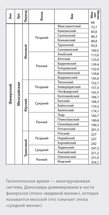 Знание названий слоев горных пород и наиболее значимых дат важно для людей, интересующихся древней жизнью и историей эволюции. Из-за того, что одни и те же термины (такие как мезозойский и меловой) применяются и к слоям горной породы, и к промежуткам времени, получаются два параллельных набора терминов – тираннозавры жили во время позднего мела, но их окаменелости происходят из горных пород верхнего мела. Мы старались не смешивать эти две системы наименования в нашей книге.