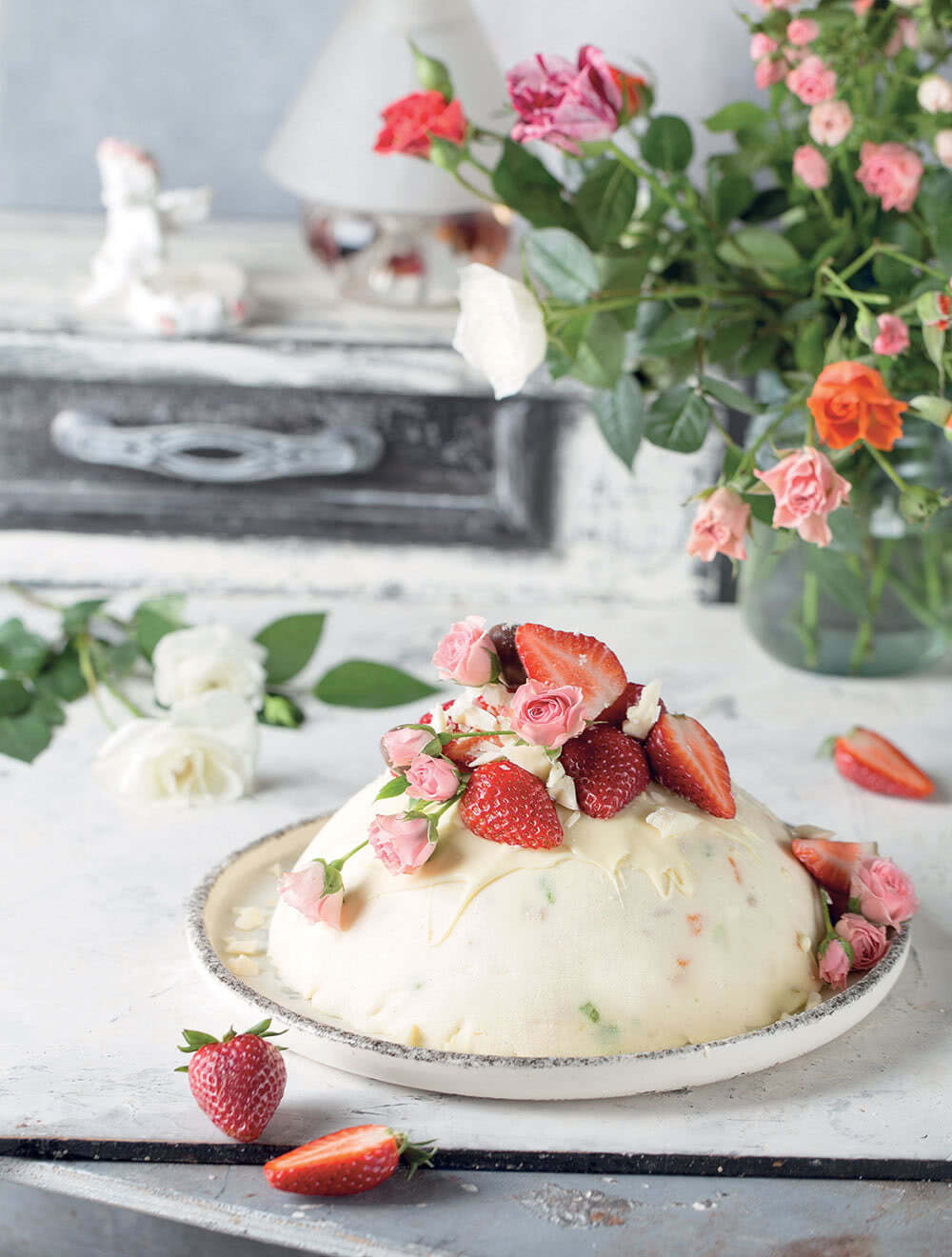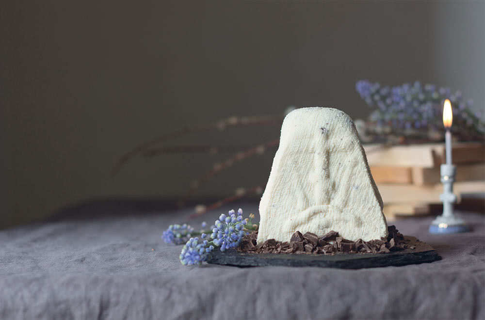 5. По истечении времени аккуратно перевернуть на сервировочное блюдо, снять форму и марлю. Можно украсить пасху растопленным белым шоколадом, на него сверху положить свежую клубнику, кусочки шоколада и розы, а можно ничем не украшать.