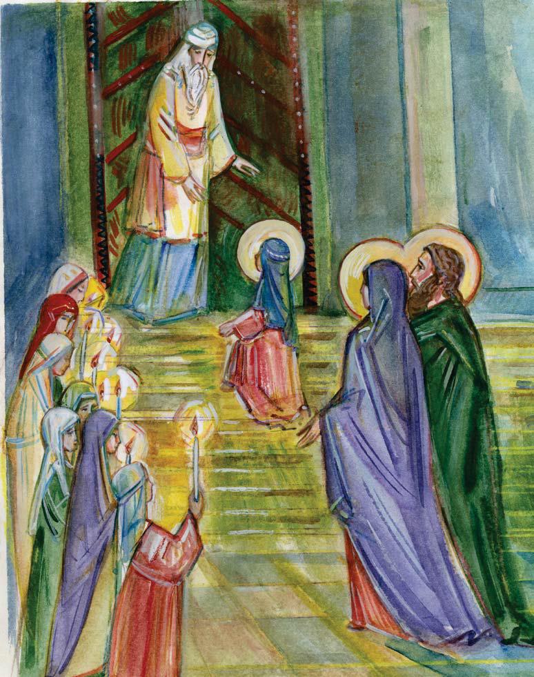 Когда Деве Марии исполнилось три года, благочестивые родители Ее приготовились исполнить свой обет. Наступил очень важный момент в жизни Той, Которой предстояло стать матерью Самого Бога. Иоаким и Анна созвали родственников, пригласили сверстниц своей дочери, одели Ее в лучшие одежды и, провожаемые народом, с пением духовных песен, повели Ее в Храм Иерусалимский для посвящения Богу. Ее подруги-сверстницы, как и Сама Мария, шли с зажженными свечами в руках. Лица всех были озарены радостью. Девочки шли с пением духовных песен, и их голоса сливались с пением Ангелов.