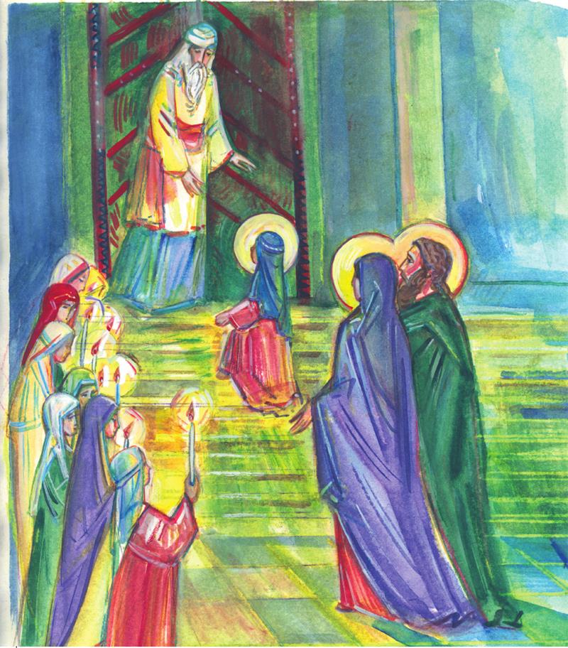 И наконец, наступил очень важный момент в жизни Той, Которой предстояло стать Матерью Самого Бога. Введение Девы Марии в Иерусалимский Храм происходило в очень торжественной обстановке. Иоаким и Анна в честь этого праздника устроили красивое и радостное шествие к Храму. Впереди шли маленькие девочки, ровесницы Пресвятой Девы, с зажжёнными свечами в руках, а за ними – Иоаким и Анна вместе со своей дочерью, держась за руки. Замыкали шествие многочисленные родственники, среди которых были известные и богатые люди. Все радовались и веселились. Девочки пели песни, и Ангелы незримо торжествовали с людьми.