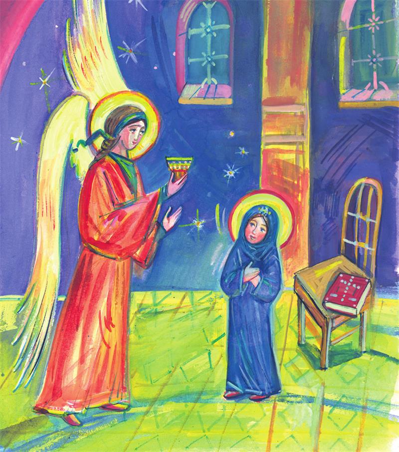 Пресвятая Дева Мария всех удивляла. Она старалась всем помочь, ни на кого не сердилась и никого не обижала, очень старалась делать хорошо всё, что ей поручали. Но особенно удивляло людей то, что Она очень любила молиться Богу в одиночестве. Для этого Ей разрешили в любое время дня и ночи заходить в Святое Святых, хотя туда даже простые священники не допускались, только главный – раз в год. А Она бывала там каждый день, молилась Богу и даже беседовала с Его Ангелами!