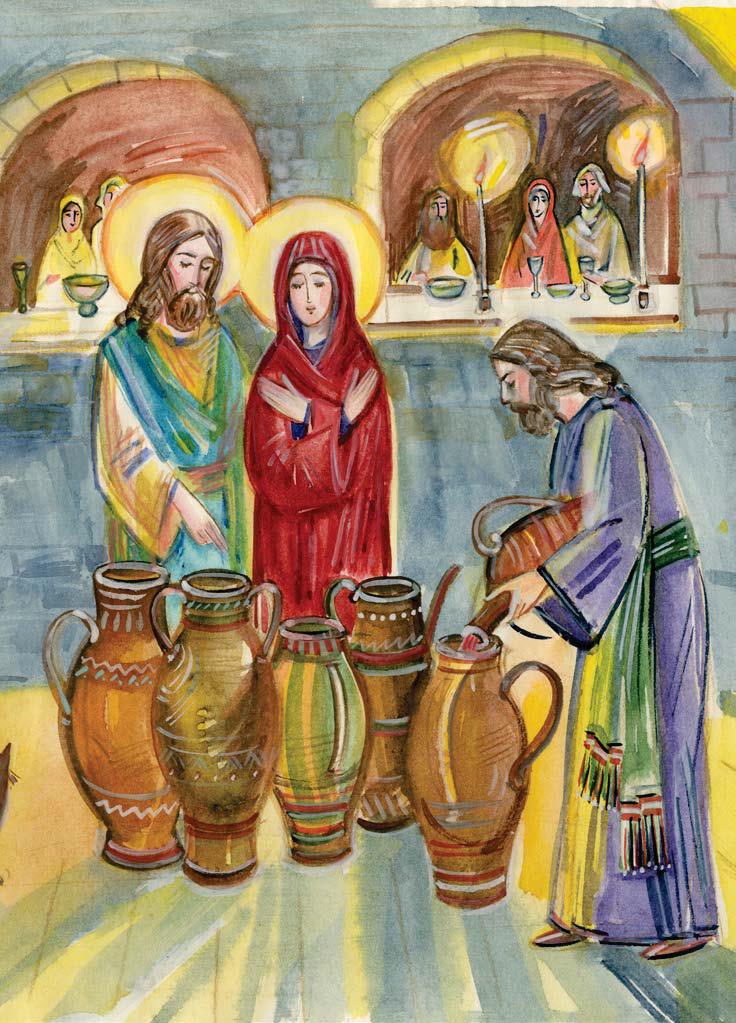 Иисус Христос пришел в Галилею. На третий день после признания Иисусом Христом Нафанаила совершался брак (свадьба) в Канне Галилейской. Предание говорит, что это был брак Симона Кананита, родственника Божией Матери, поэтому на свадебных торжествах была Богоматерь; был также зван Иисус и ученики Его. Недоставало вина. Богоматерь говорит Иисусу: «Вина нет у них». Он отвечал Ей: «Еще не пришел час Мой». Из этого ответа Пресвятая Мария поняла, что еще не пришло время, чтобы явить Ему Свою божественную силу. Но Она знала любовь Своего Сына к людям и была уверена, что Он непременно поможет нуждающимся, и потому сказала слугам: «Что скажет вам, то сделайте». Было в доме шесть каменных сосудов, в которые наливалась вода для омовения. Иисус и говорит слугам: «Наполните сосуды водою». Слуги наполнили их доверху. «Теперь почерпните и несите к распорядителю пира». Понесли. Распорядитель, отведав воды, сделавшейся вином, позвал жениха и сказал ему: «Всякий подает сперва хорошее вино, а когда довольно пили, тогда худшее, а ты хорошее вино берег доселе».