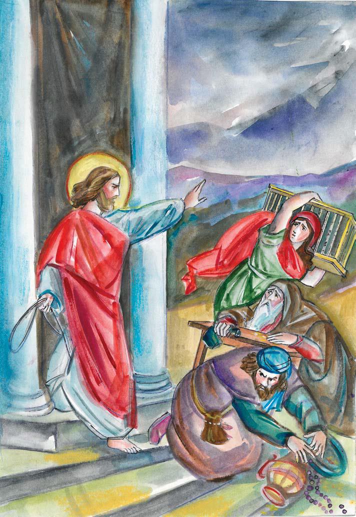 Сделав бич из веревок, Спаситель выгнал из Храма продавцов, также и овец и волов; деньги у меновщиков рассыпал и столы их опрокинул и сказал продающим голубей: «Возьмите это отсюда и дома Отца Моего не делайте домом торговли». На это Иудеи сказали: «Каким знамением докажешь Ты нам, что имеешь власть так поступать?» Иисус отвечал: «Разрушьте Храм сей, и Я в три дня воздвигну его». Иудеи сказали: «Этот храм строился сорок шесть лет, и Ты в три дня воздвигнешь его?» Но Он говорил о храме Тела Своего, т. е. о Церкви христианской, которая должна была образоваться в результате Крестных Страданий, смерти и Воскресения Его.