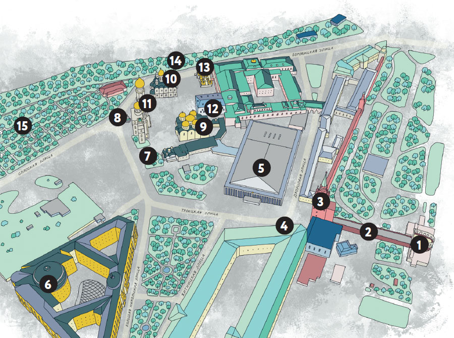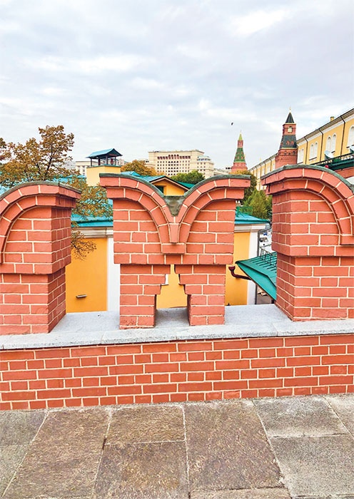 Войти на музейную территорию Кремля через ① Кутафью БашнюГлавная изюминка башни – необычная верхушка. Полюбуйтесь! Словно красно-белая корона с арочками и гирьками, а на самом верху декор в виде гребней, острых пик и шарообразных наконечников. Корона делает ее непохожей не только на остальные башни Кремля, но и на башню вовсе. Больше напоминает парадные ворота. Здесь будто не хватает традиционного завершения с флагштоком или звездой. Более того, нам она кажется такой тучной и приземистой – но нужно мысленно прибавить ей метров пять-семь в высоту, чтобы представить, какой стройной и помпезной Кутафья башня была четыре века назад. Проходим через средневековые толщи стен дальше.