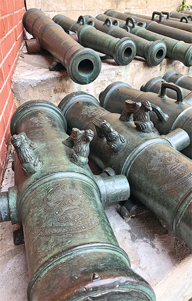 Экспозиция пушек в этом месте – настоящий музей артиллерии и искусства бронзового литья, задуманный еще Петром I в 1702 году. Здесь же на лафетах возвышаются и русские боевые орудия XVI–XVII веков, и каждое из них имеет подпись с годом отливки, весом и именем создателя. Шедевральная работа мастеров-литейщиков!
