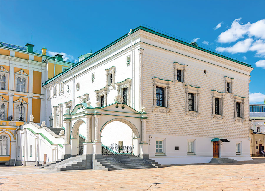 Левее от Успенского собора находится трехэтажное здание с двумя красивыми арками, увенчанными двуглавыми орлами. Это ⑫ Грановитая Палата, построенная в 1487–1508 годах, и сегодня это самая древняя сохранившаяся гражданская постройка в Москве. Внутри находился царский банкетный зал, который использовали для дворцовых церемоний, государственных совещаний и приемов иностранных послов.