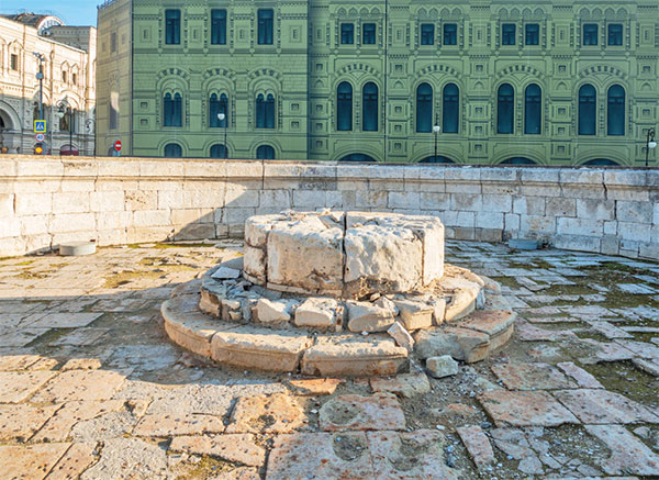 На ⑪ Лобном месте никого не казнили. Это факт. Наш полет фантазии, когда мы смотрим на челобитный столб в центре Лобного места, плюс сцены казни в зарубежном кинематографе, плюс картина Сурикова «Утро стрелецкой казни» утвердили в нас образ того, что Лобное место – это какое-то плохое место, где казнили людей. Напротив, оно всего лишь трибуна, с которой зачитывались важные государственные новости во всеуслышание. Этакий телевизор или интернет XVI столетия. «Инфоповодом» в те времена были, например, такие новости, как: в столицу привезли чудотворную икону, родился наследник, победа или поражение в битве; новый царский указ о чем-нибудь или о чьей-то казни. Лишь зачитать о казни, но не казнить. Сама казнь проходила либо на Васильевском спуске, либо на Болотной площади.