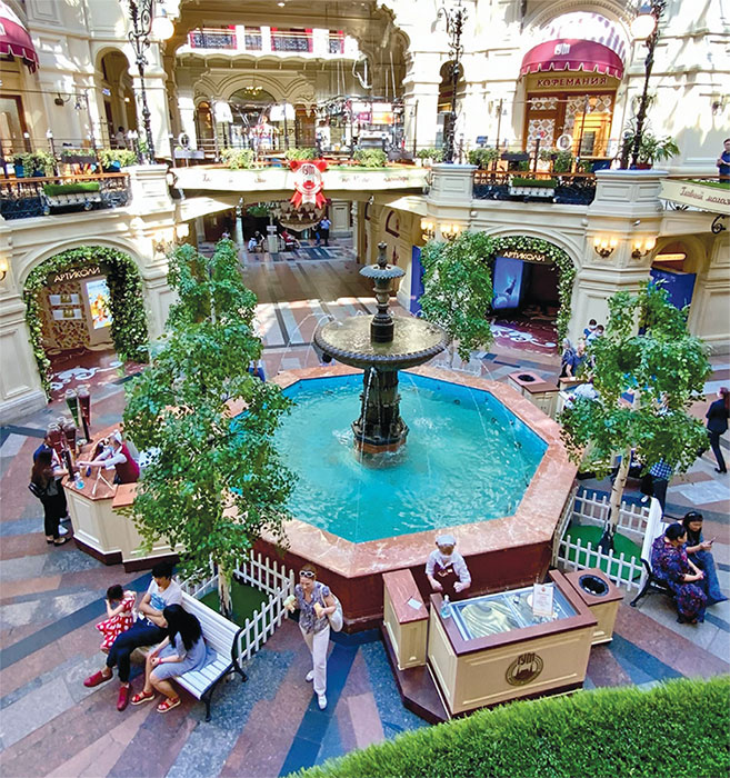 «Встречаемся в ГУМе у фонтана!» – сегодня эта фраза неактуальна, но в советские времена, когда у граждан не было мобильных телефонов, ⑬ фонтан в центре Главного универсального магазина был знаковым местом встреч и свиданий. История знаменитого фонтана начинается в 1893 году вместе с постройкой нового здания Верхних торговых рядов. Для публики того времени это был удивительный аттракцион! Сегодня фонтан модернизировали, изменив систему гидравлики. Он работает круглый год, имеет уникальную конструкцию и является одним из любимых мест посетителей, ведь это не просто украшение магазина, но и важный элемент PR: в зависимости от времени года фонтан превращают в арт-объект. Ранней весной он обильно украшен цветами с ленточками, летом в нем плавают ароматные дыни и огромные арбузы, осенью его декорируют колосьями, а зимой, под Новый год, превращают в гигантскую елку с игрушками, а вокруг устраивают елочный базар.