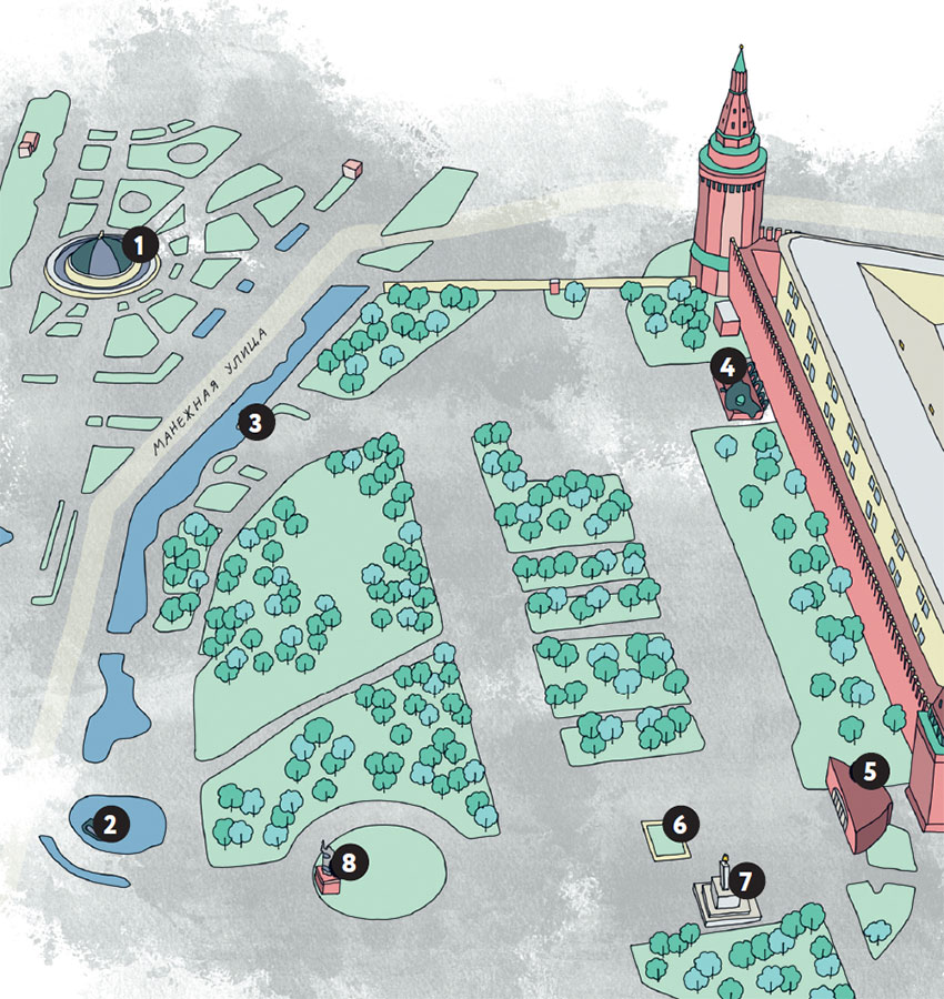 На небольшой площади перед гротом прямо у себя под ногами можно увидеть бронзовый слиток с подробной ⑥ картой Александровского сада. История появления Александровского сада связана с окончанием французского вторжения 1812 года. Российский император Александр I назначил архитектора Осипа Бове провести восстановительные работы по всей Москве. В районе Кремля Бове задумал убрать реку Неглинную под землю, а сверху устроить ландшафтный парк с прекрасными садами. Вначале сады называли Кремлевскими, а в 1856 году, когда произошло вступление на трон императора Александра II, за парками закрепилось название «Александровские сады». По сути, это был первый парк Златоглавой, москвичи обожали здесь прогуливаться. Сегодня Александровский сад протянулся более чем на 850 метров и охватывает территорию в 10 гектаров.