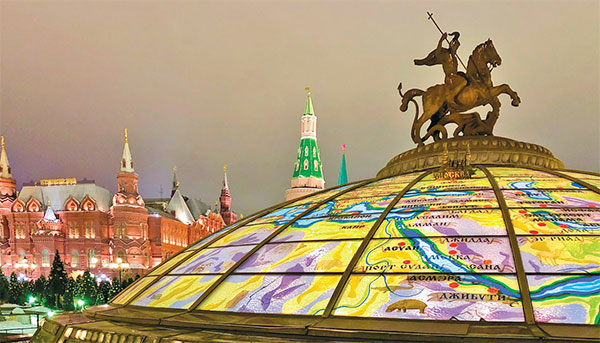 ① Фонтан «Часы мира» – настоящая шкатулка с секретом на Манежной площади, созданная в 1997 году. Он вращается, брызгает, мерцает и показывает мировое время в разных уголках планеты. Но многие этого не замечают, думая, что это просто красивый фонтан-купол со скульптурой Георгия Победоносца на коне. Как же определить время по этим часам? Это и правда неочевидно, хотя задумка классная. Итак, всмотритесь: на полусфере изображена карта звездного неба над Северным полушарием с названиями некоторых городов мира. Прежде всего найдите на карте Москву – ее невозможно не заметить, так как она представляет собой бронзовую скульптуру с башнями Кремля и храмом Василия Блаженного. Получается, что вся карта – это циферблат, скульптура Георгия Победоносца – центр циферблата, а Москва – стрелка. Риски – золотые цифры под стеклом на уровне наших глаз. Купол разделен гранями на 24 сектора (24 часа в сутках), каждый из которых соответствует одному из часовых поясов. Благодаря горящим лампочкам можно узнать минутные показатели. Нужно подсчитать их количество и умножить значение на 5. Вся конструкция, кроме цифр внизу, двигается 24/7. Медленно, очень медленно, но двигается. Это возможно увидеть, если всмотреться. Благодаря расчетам, ровно за сутки «Часы мира» осуществляют полный оборот вокруг собственной оси. С их помощью можно легко узнать время в любой столице мира. Для этого нужно выбрать город, а потом посмотреть вниз на кольцо. Это и будет искомое время. Желаю фонтану «Часы мира» реставрации, а то сегодня, спустя почти 30 лет, он выглядит как будто уставшим.