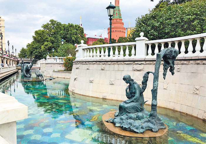 Фонтан «Четыре сезона» визуально словно ниспадает в безумно красивый фонтанный комплекс, напоминающий старинную реку Неглинную. Неглинка действительно когда-то бежала здесь вместо Александровского сада вдоль Кремлевской стены. Теперь река протекает в подземном коллекторе, а мы можем гулять вдоль ③ фонтана «Герои сказок» с мраморными мостиками, балюстрадами и мозаикой с рыбками на дне. Здесь вы встретите Ивана-царевича с Лягушкой, Жар-птицу, Царевну Лебедь, Лисицу и Журавля, Русалку, а к старику с Золотой рыбкой из сказки Пушкина можно подойти совсем близко и загадать желание.