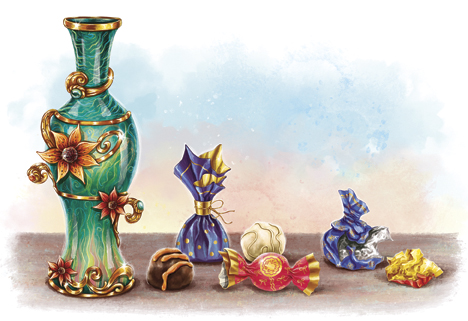 Зефирушка съела вторую, третью конфету, увидела, что на подоконнике валяются лишь пустые обертки, полезла в карман за новой порцией. Вытаскивать что-то из кармана, лежа животом на подоконнике, неудобно. Зефирка выпрямилась, случайно задела лапкой керамическую бутылку, которая стояла рядом, та упала в сад, угодила прямо на каменную отмостку дома и вмиг превратилась в гору осколков.