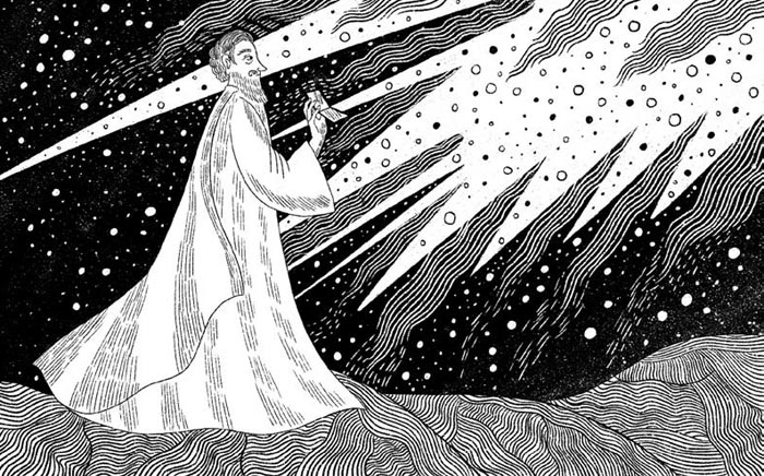 Сначала Киту показалось, что человек похож на Тётьлиду. Это был кто-то невысокий, плотный, в строгой одежде и маленьких круглых очках. По том фигура вытянулась, на голове у неё возникла шляпа, а в руках трость. Все замерли. Фигура двигалась плавно, как будто не шла, а летела над самой землёй. Поравнявшись с ними, фигура опять изменилась: теперь она была похожа на мальчика в высоком чёрном цилиндре. Но мальчик был какой-то странный, как будто кто-то вспоминал, как мог бы выглядеть ребёнок их лет, но никак не мог вспомнить до конца. Кит не улавливал, в чём же заключалась эта неправильность. И это его беспокоило. Мальчик остановился напротив куста, за которым они стояли. Он внимательно смотрел на них, но как будто не видел, только, возможно, чувствовал.