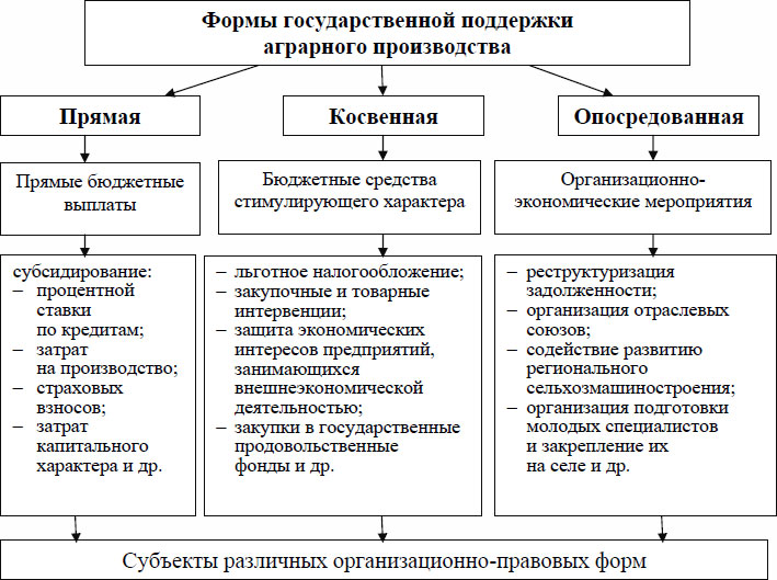 Первая – форма прямой бюджетной поддержки – включает предоставление субсидий на материально-технические ресурсы и сельскохозяйственное производство, субсидирование краткосрочного и инвестиционного кредитования организаций и предприятий агропромышленного комплекса, предоставление субсидий сельхозтоваропроизводителям на возмещение части затрат по страхованию урожая сельскохозяйственных культур, субсидирование расходов капитального характера и др.