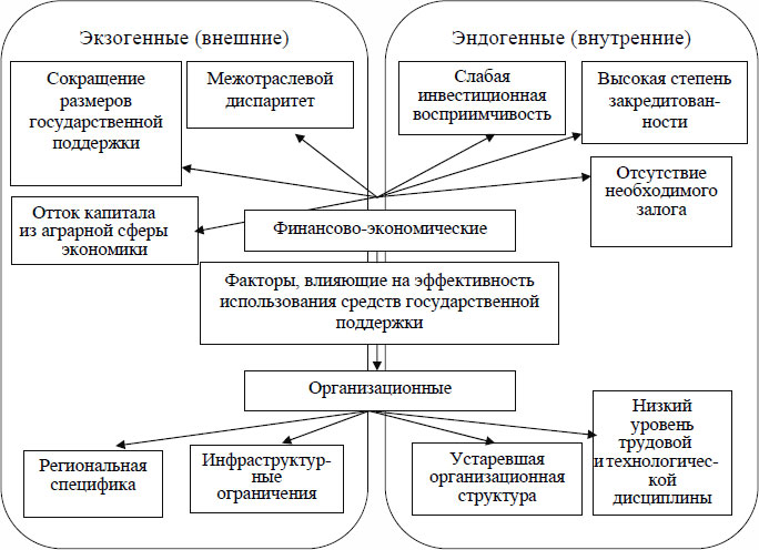 Также в результате проведенного исследования выявлены внутренние и внешние факторы и причины неэффективного использования сельскохозяйственными организациями средств государственной поддержки, основные из которых представлены на рисунке 3.