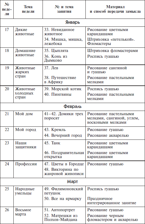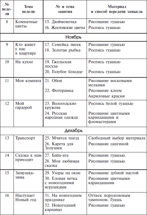 Занятия (ознакомление с окружающим миром, развитие речи, лепка, аппликация, рисование) составлены по тематическому принципу: одна и та же тема изучается в течение недели.