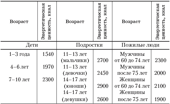 Суточная потребность детей, подростков и пожилых людей в энергии