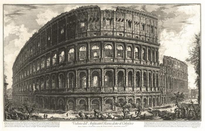 Тот же Колизей в таком же виде, как и на картине Беллотто, но с другого ракурса. Впрочем, Пиранези тоже считается фантазером-руинистом. У него огромное количество гравюр, которые если поделить на время его творческой деятельности он делал раз в неделю. Именно поэтому многие думают, что гравюры тех времен делали не по известной сложной технологии изготовления, а по-иному. И это была своего рода фотография, которую можно было многократно копировать.