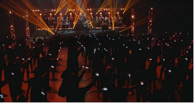 В кадре мир поделен на два класса. Элита на сцене и остальные в зале. У элиты есть лица, права, ресурсы. У остальных нет лиц, нет прав, они делают то, что велит элита.