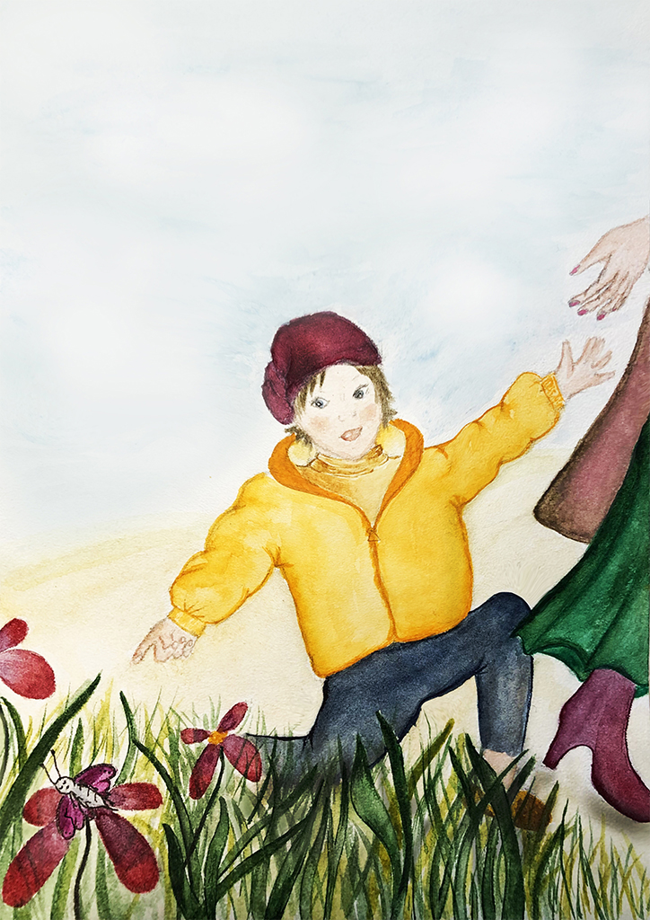 Малыш нёс бабочку в открытой коробочке. Они дошли до полянки, где той осенью они нашли бабочку. Малыш посмотрел на маму, она улыбнулась и кивнула ему. Малыш поставил коробочку на траву. Бабочка радостно выпорхнула и закружилась над цветами. К ней тут же подлетели другие разноцветные бабочки.