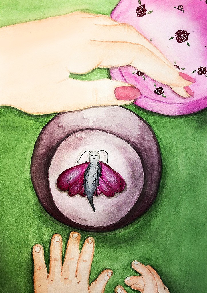 Малыш бережно взял бабочку на ладошку и, прикрывая осторожно сверху другой, отправился вместе с мамой домой. Дома они нашли самую красивую коробочку, на которой были нарисованы розочки. Малыш аккуратно положил бабочку в коробочку.