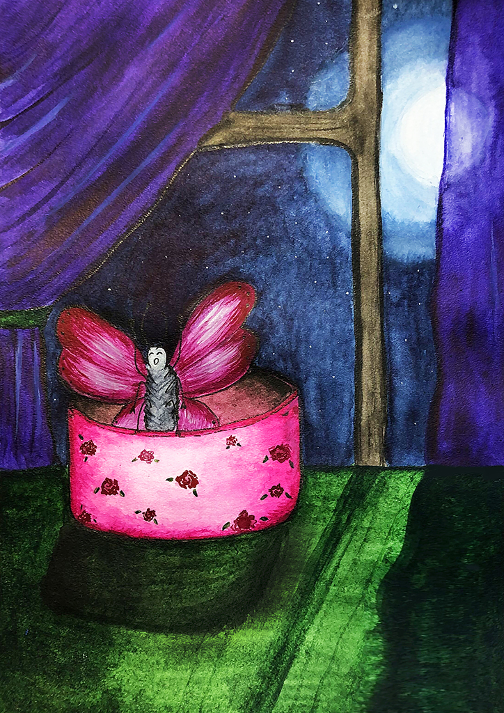 Однажды малышу приснилось, что бабочка не с ним, а на лугу, одна. Проснувшись, он побежал к столу. Но ни коробочки, ни бабочки на нём не было. Малыш испугался, что сон сбылся, и побежал в другую комнату, и, едва увидев маму, сидевшую за своим швейным столом, закричал сквозь хлынувшие градом слёзы: – «Мама, она пропала! Моя бабочка, её нет!»