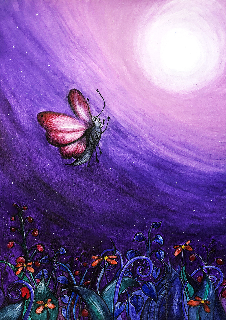 С этого дня каждую ночь, пока все спали, бабочка вылетала на улицу через открытое окно в спальне, через которое проникал свежий весенний воздух и манил её. Она летала над цветочными лугами, но каждый день она возвращалась к малышу, чтобы не расстраивать его.