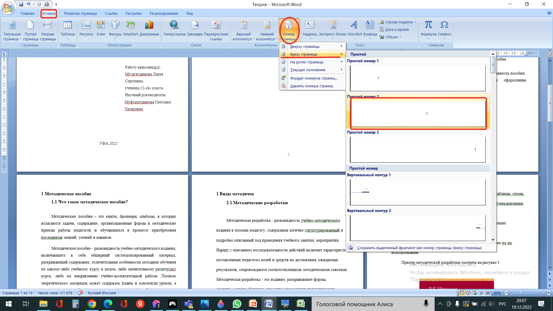 3) Далее нажимаем на «Внизу страницы» и выбираем 2 вариант, где расположение нумерации идет посередине.