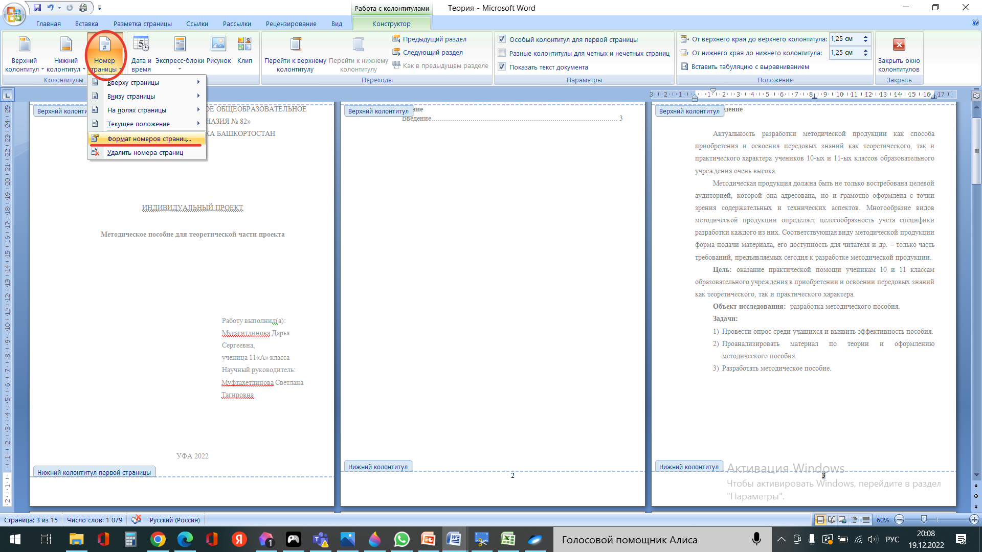 Следующей частью является блок с данными ученика и научного преподавателя. После темы работы необходимо пропустить 4 пустые строки.