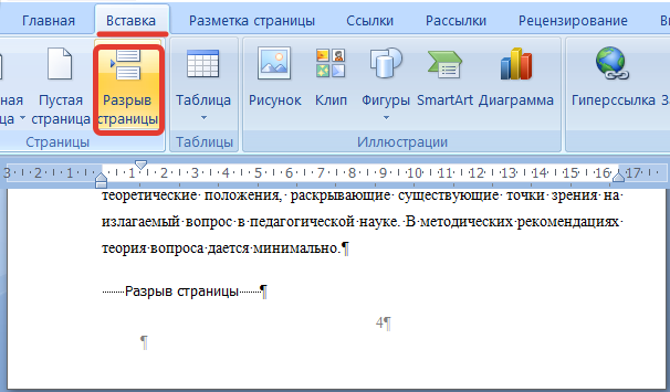 1) Открываем документ. Ставим курсор в том месте, после которого нужно сделать разрыв страницы и выбираем «Вставка», «Разрыв страницы».