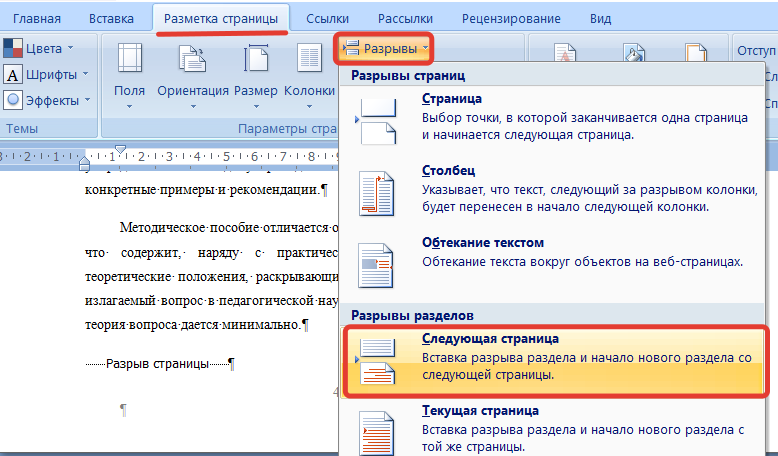 1) Выбираем «Разметка страницы» и «Разрыв».