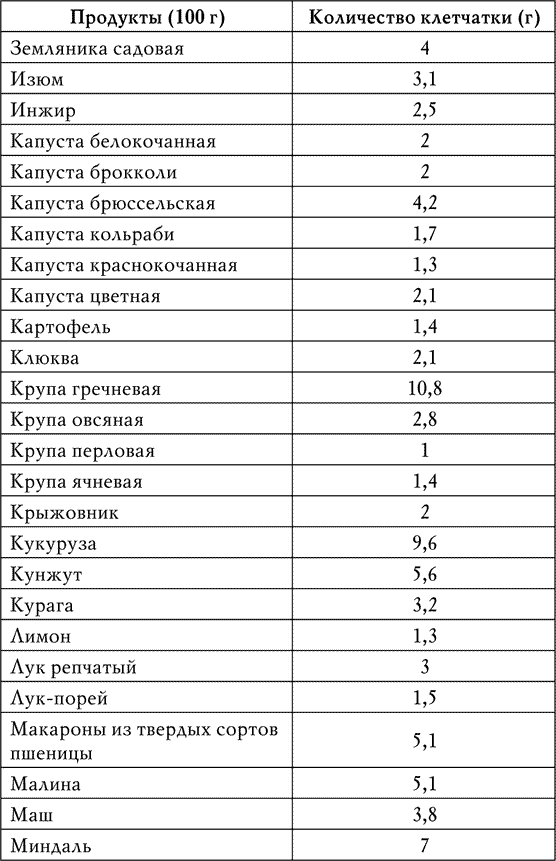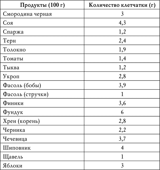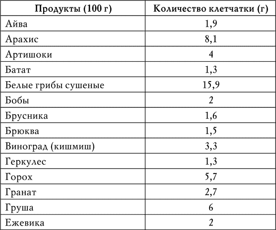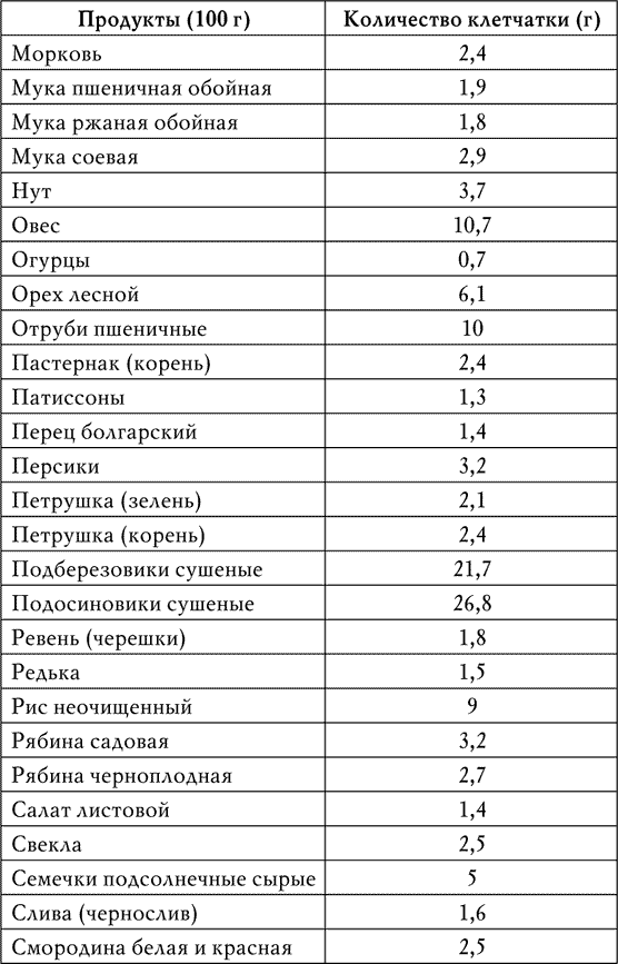 Для этого необходимо иметь перед глазами список хотя бы основных продуктов, богатых клетчаткой, с указанием ее количества в граммах (табл. 1).